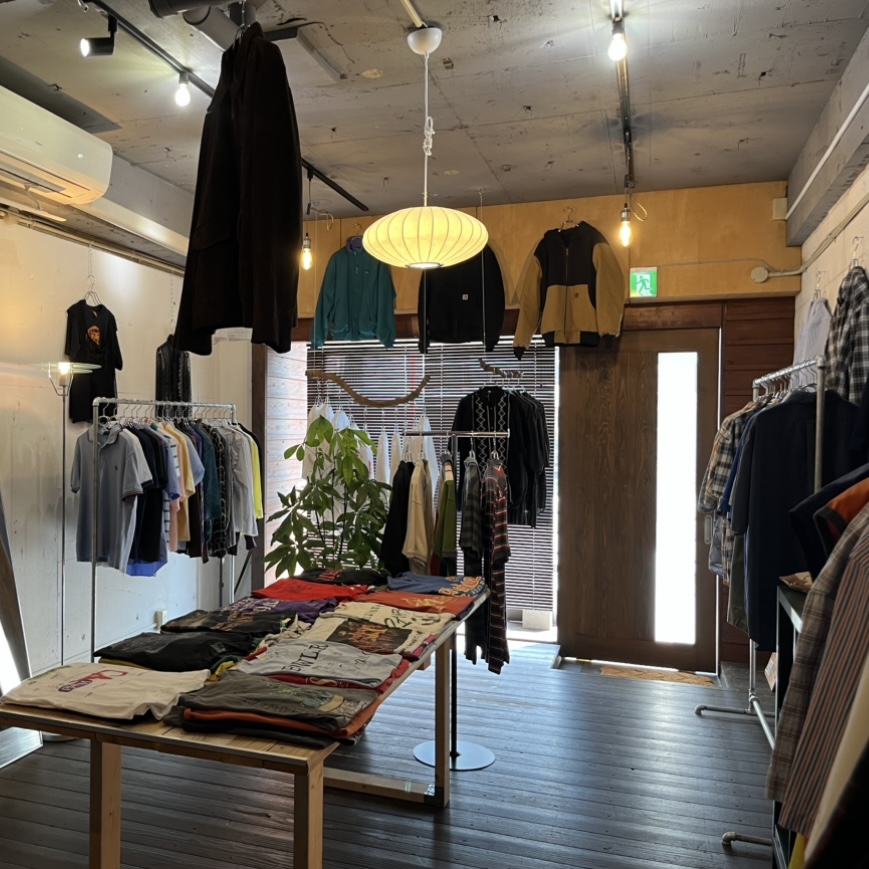 白を基調とした明るくシンプルな内装に、大きなショーウィンドウから自然光が差し込む小さな古着屋です。
